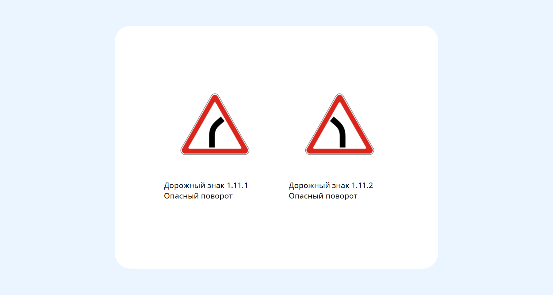 Прямая с загибом вправо — знак 1.11.1 «Опасный поворот (правый)», прямая с загибом влево — знак 1.11.2 «Опасный поворот (влево)».