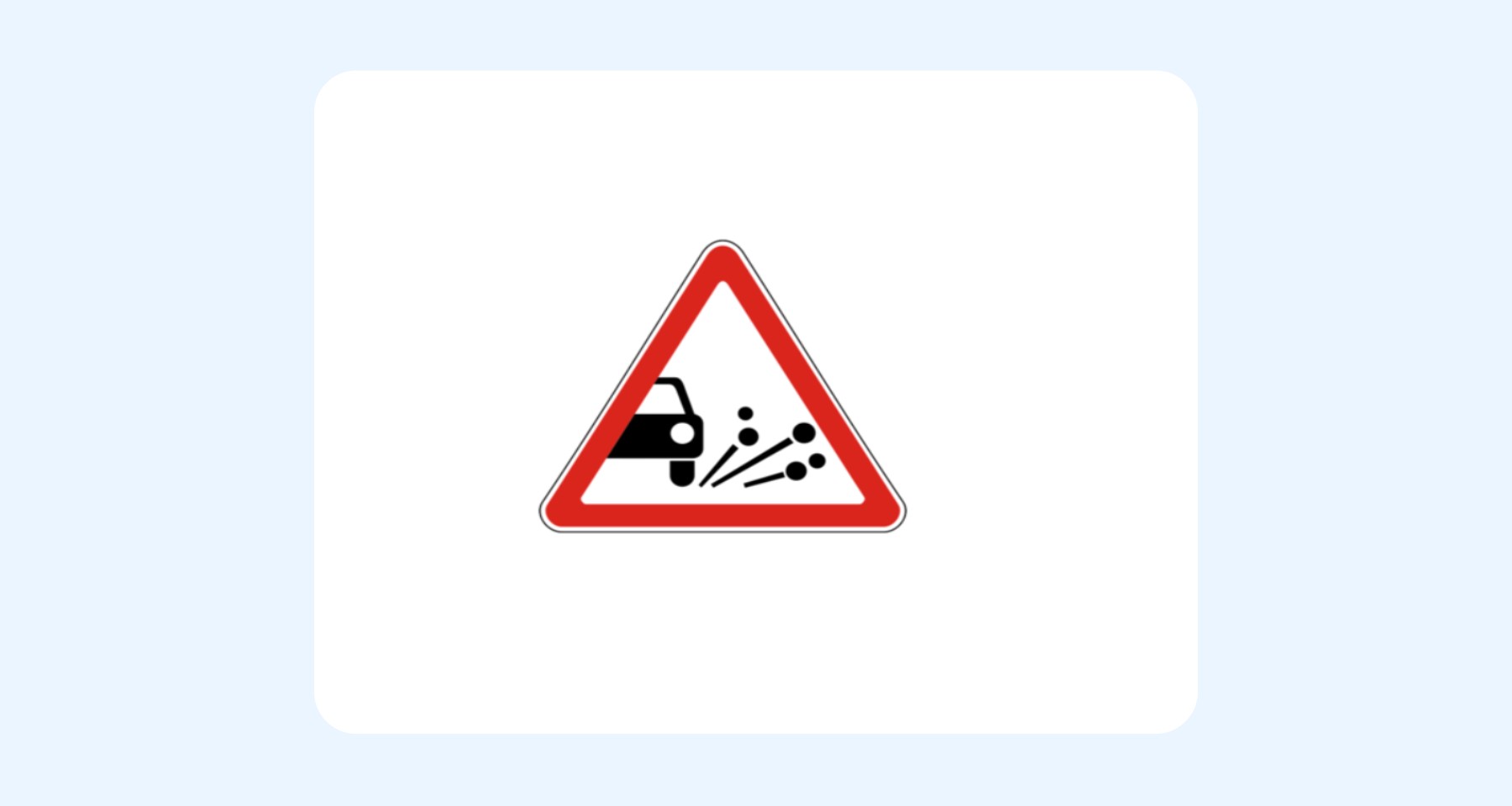Из-под колес машины по разной траектории летят камни — это изображение знака 1.18 «Выброс гравия».