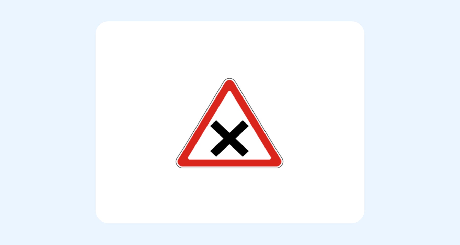 Знак 1.6 — скрещивающиеся под прямым углом черные линии в центре типичной предупреждающей таблички — «Пересечение равнозначных дорог».