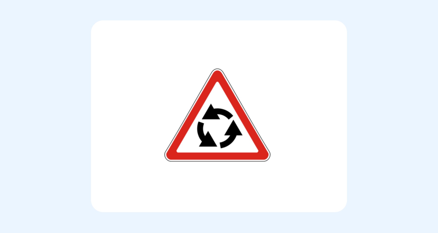 Белый треугольник с красной окантовкой, в центре изображены три черные круговые стрелки с движением против часовой стрелки — это знак 1.7, «Пересечение с круговым движением».