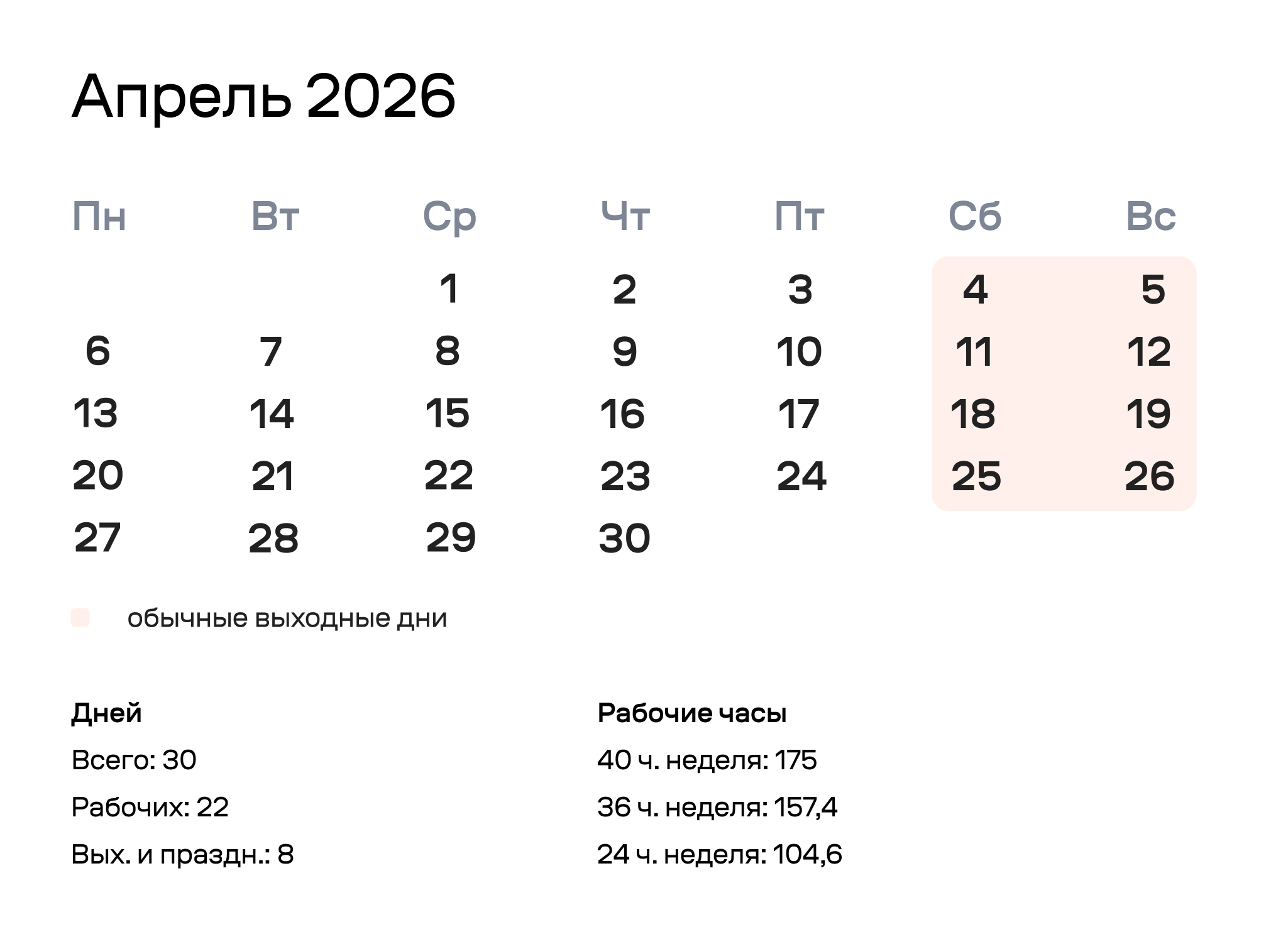 По нормам рабочего времени апрель 2026 года выглядит так: