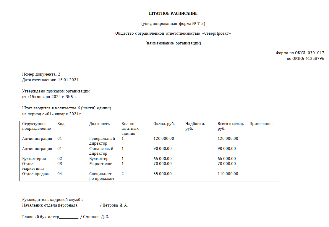 Кстати, в отличие от других кадровых документов, таких как трудовой договор или должностная инструкция, штатное расписание носит обезличенный характер и не содержит информации о конкретных сотрудниках.