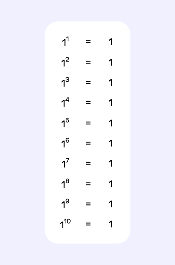 С единицей все предельно просто. Какое бы большое число вы ни поставили в качестве показателя, результат всегда останется один. Единица, умноженная сама на себя сколько угодно раз, всегда даст единицу. Это уникальное свойство, которое полезно помнить.