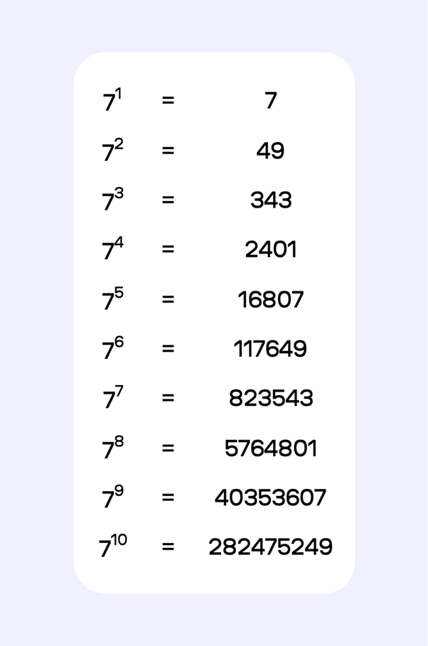 Семерка — простое число, и ее степени растут быстро. Готовая таблица значений степеней избавляет от необходимости запоминать эти числа.