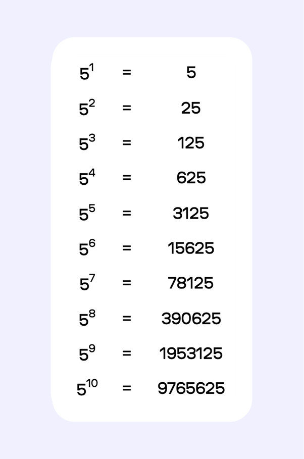 Степени пятерки имеют свою изящную закономерность: если посмотреть на результаты, можно увидеть, как в конце чисел появляются 5 или 25. Это числа, которые легко умножать в уме.