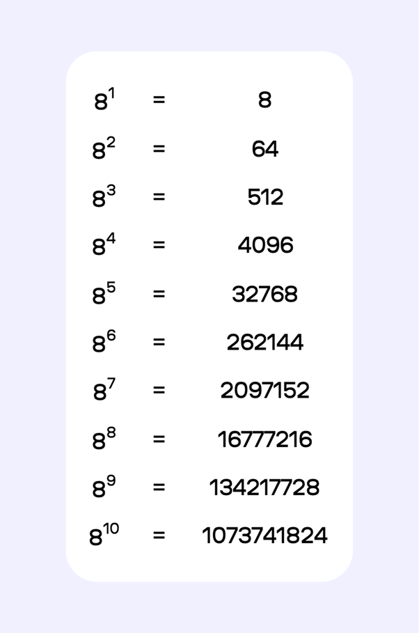 | 8¹⁰ | 1 073 741 824 |