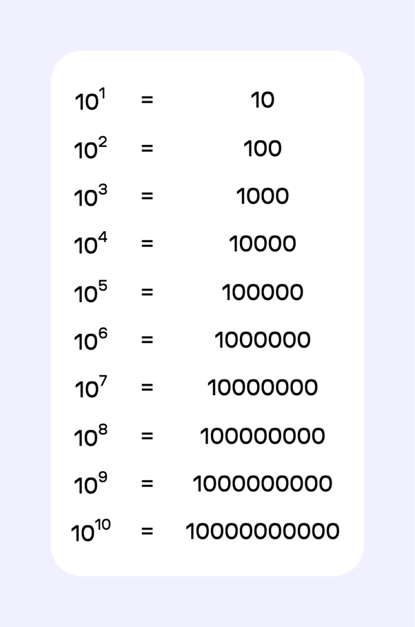 Степени десятки — самые простые для запоминания и самые наглядные. Показатель степени просто показывает, сколько нулей нужно приписать к единице. 10³ — это тысяча (1 и три нуля), 10⁶ — миллион.