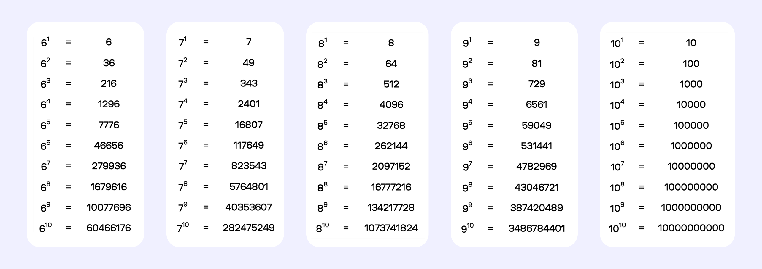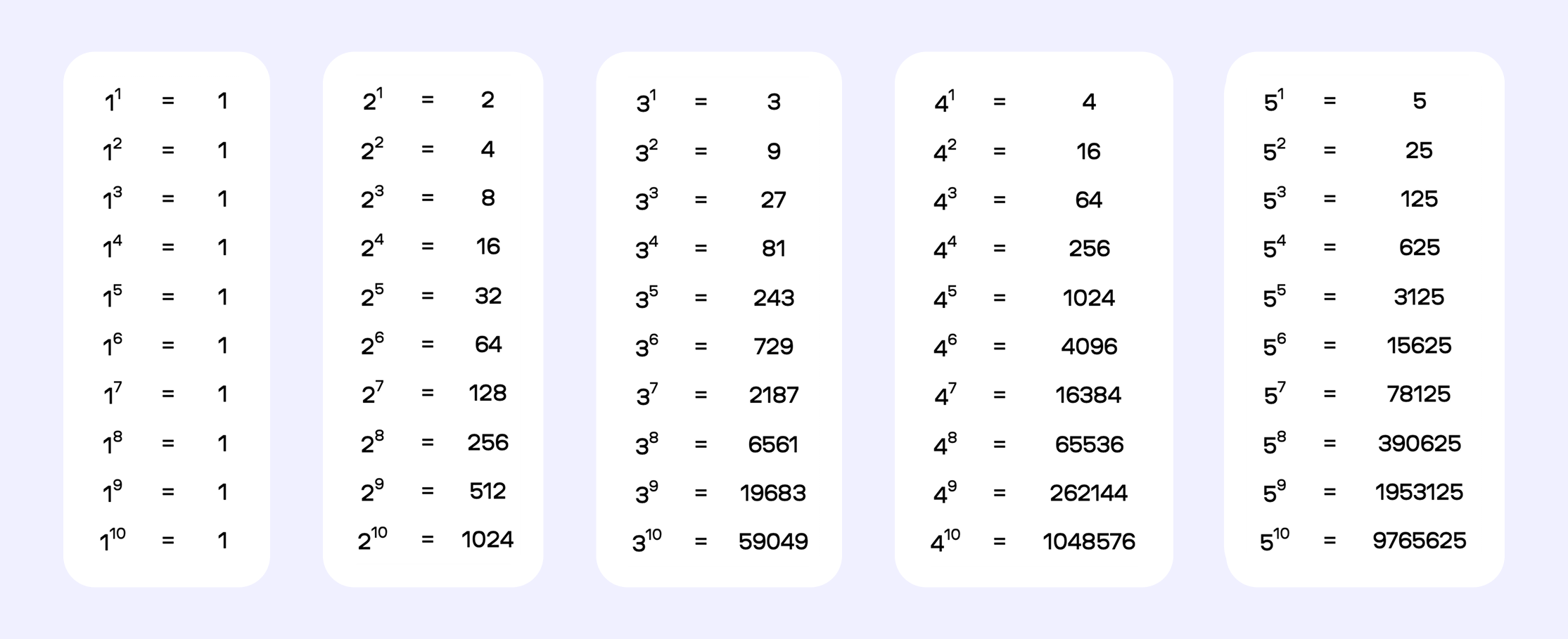 Чтобы не вычислять каждый раз заново, удобно пользоваться готовой таблицей. Перед вами универсальная таблица степеней для чисел от одного до десяти, возведенных в степени от первой до пятой. Эти значения встречаются чаще всего в школьных задачах и бытовых расчетах.