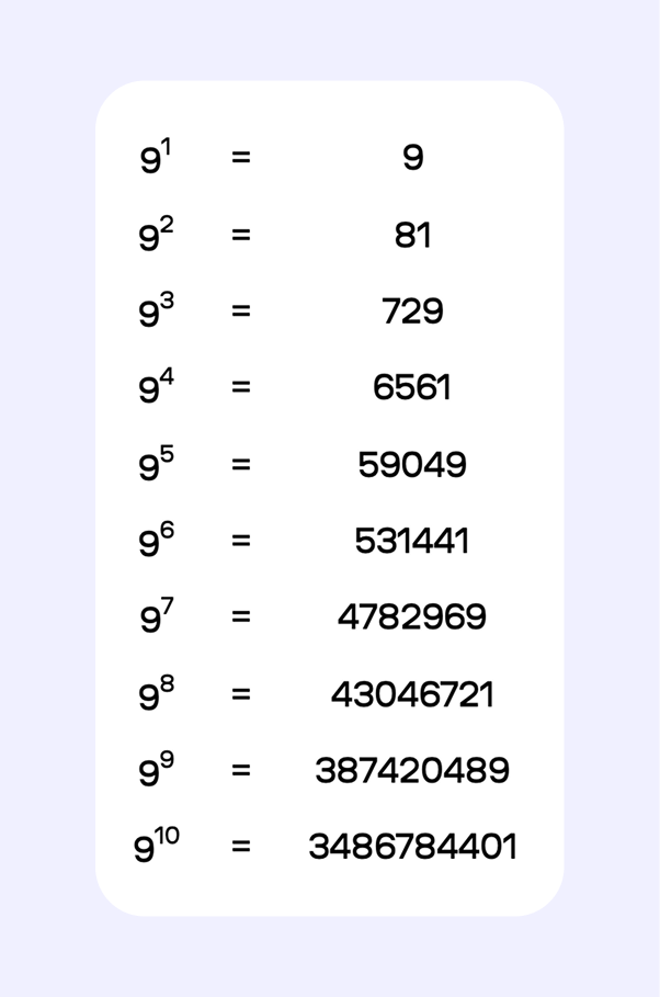 Девятка — это квадрат числа три (3² = 9). Зная степени тройки, можно вычислить и степени девятки, но для наглядности приведем отдельную таблицу.