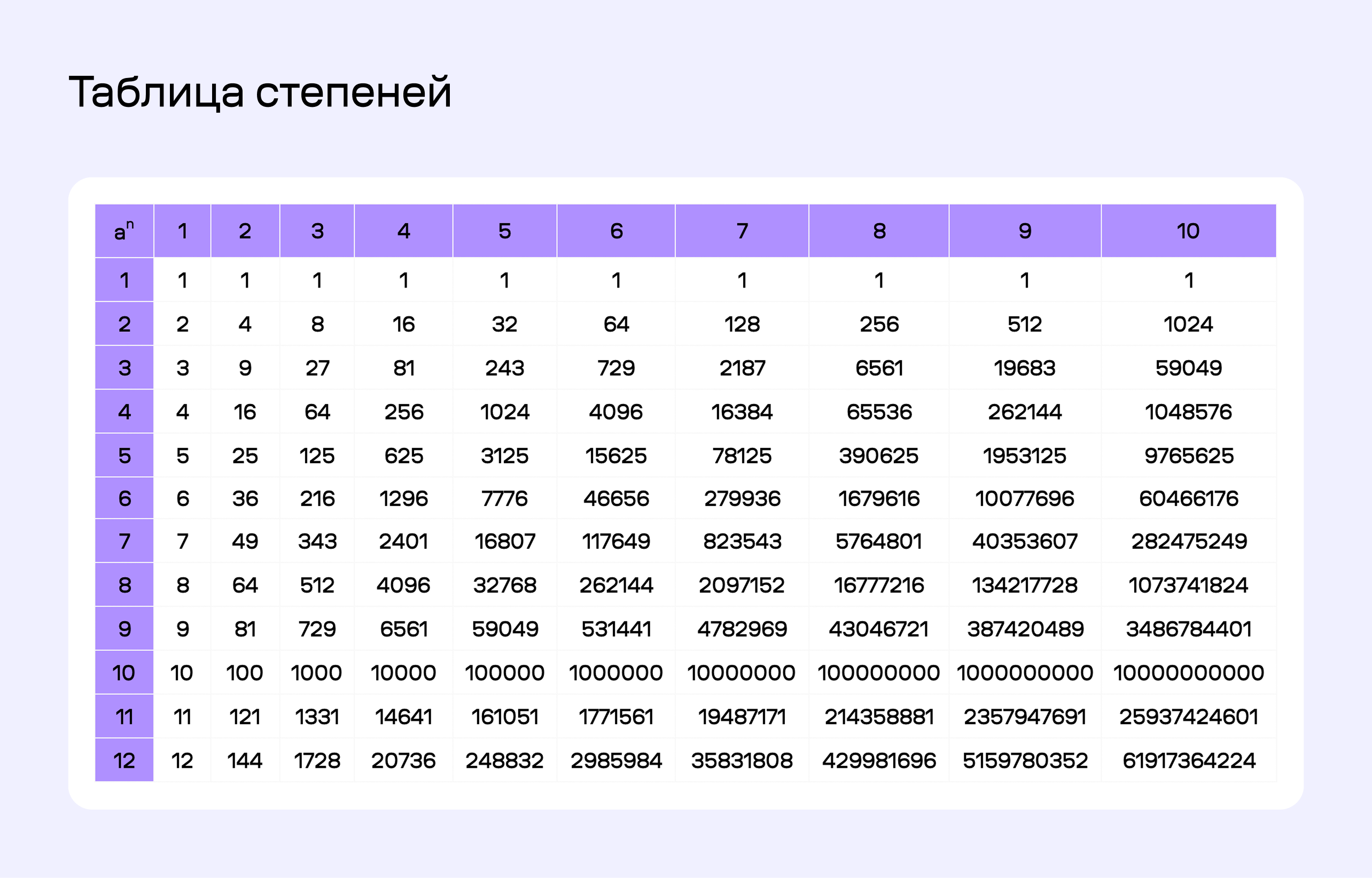 Таблица степеней от 1 до 10.