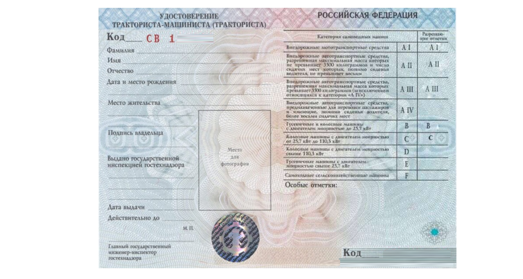 В разделе «Особые отметки» удостоверения указываются конкретные профессии: «Тракторист 5-го разряда», «Машинист экскаватора 6-го разряда», «Водитель погрузчика». Это определяет точные полномочия владельца удостоверения. Разряды от 2-го до 6-го зависят от сложности техники и опыта оператора.
