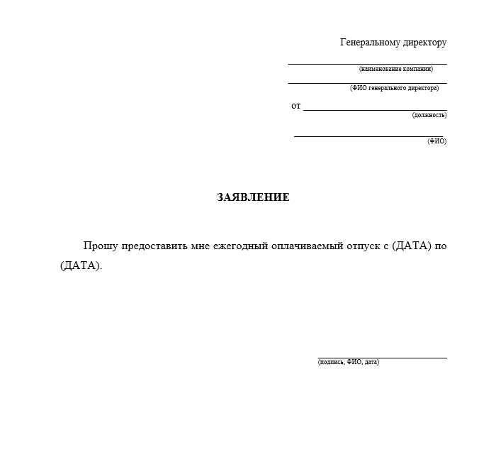 Заполнение начинают с шапки документа. В ней указывают должность и ФИО руководителя или иного адресата, затем сведения о работнике: должность, подразделение и ФИО. После этого пишут название документа — заявление — и формулируют саму просьбу о предоставлении отпуска. В основном тексте важно указать вид отпуска, дату начала, дату окончания или количество календарных дней. Если отпуск берут не по графику, переносят или оформляют без сохранения заработной платы, это лучше сразу отразить в тексте заявления.